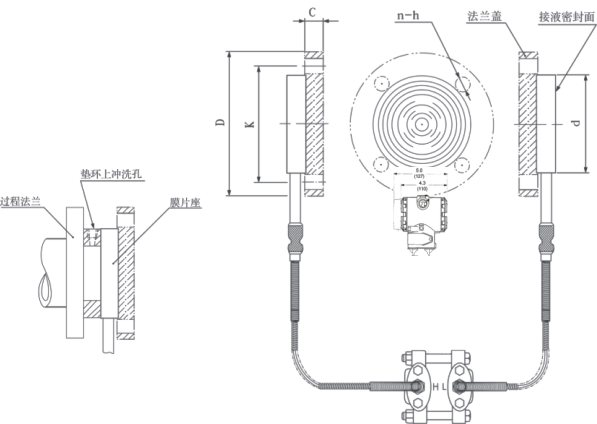 AK-3051DP雙法蘭液位變送器是一種通過安裝在管道或容器上的遠(yuǎn)傳裝置來感受被測(cè)壓力,該壓力經(jīng)毛細(xì)管內(nèi)的灌充硅油(或其它的液體)傳遞至變送器的主體,然后由變送器主體內(nèi)的δ室和放大線路板,將壓力或差壓轉(zhuǎn)換4~20mA.DC信號(hào)輸出(參見結(jié)構(gòu)原理圖)。 |